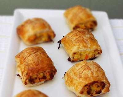 Pré-aqueça o forno a 200C e forre um tabuleiro com papel manteiga. Misture todos os ingredientes (excepto o ovo batido e massa folhada), numa tigela grande. É mais fácil fazê-lo usando as mãos. Corte cada folha de massa ao meio de modo a obter 6 rectângulos e coloque numa superfície levemente enfarinhada. Divida a mistura de frango em 6 parcelas iguais e coloque uniformemente no centro de cada rectângulo de massa.